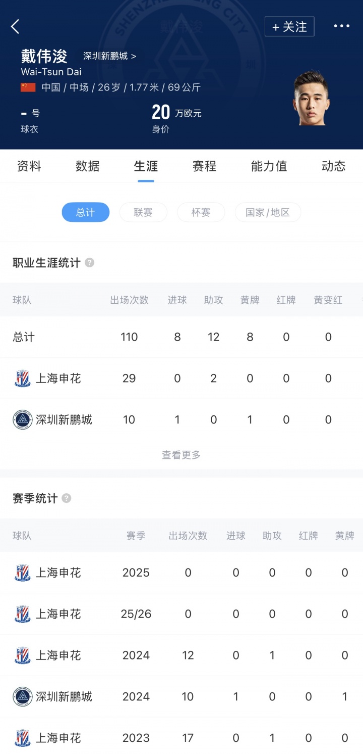 去年10月31日,戴伟浚首度入选申花的比赛名单,但最终整个赛季都没有代表申花出场。
